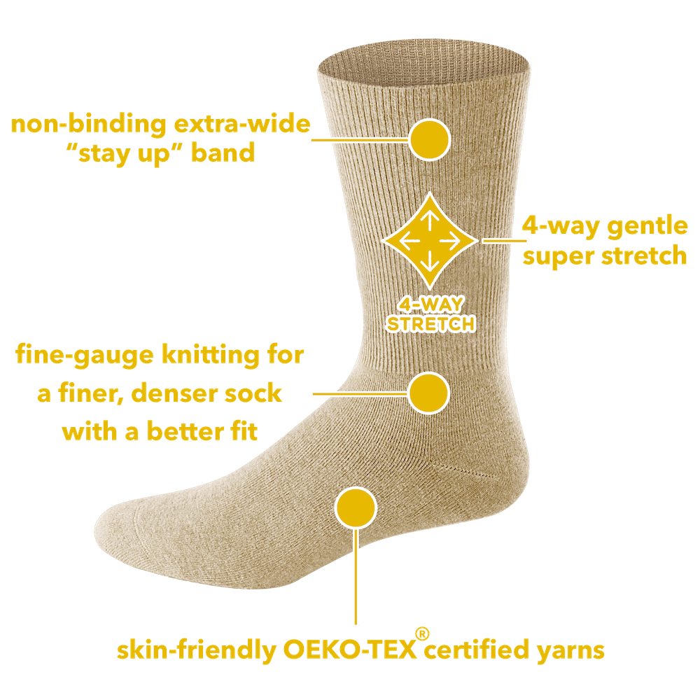 Due to their significant stretch and rebound, Old World® socks are perfectly comfortable whether you have regular, wide, or extra-wide feet, ankles, or calves. Socks will stretch easily to fit you without binding or causing discomfort