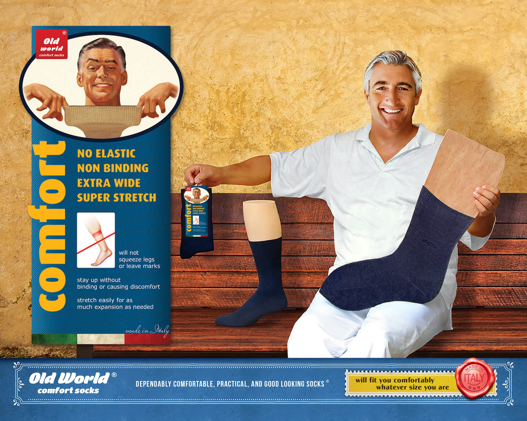 Due to their significant stretch and rebound, XL-XXL Old World® socks are perfectly comfortable whether you have regular, wide, or extra wide feet, ankles, or calves. They will stretch easily and hold their shape gently to fit you without binding, pressing, constricting, leaving dents, or causing discomfort